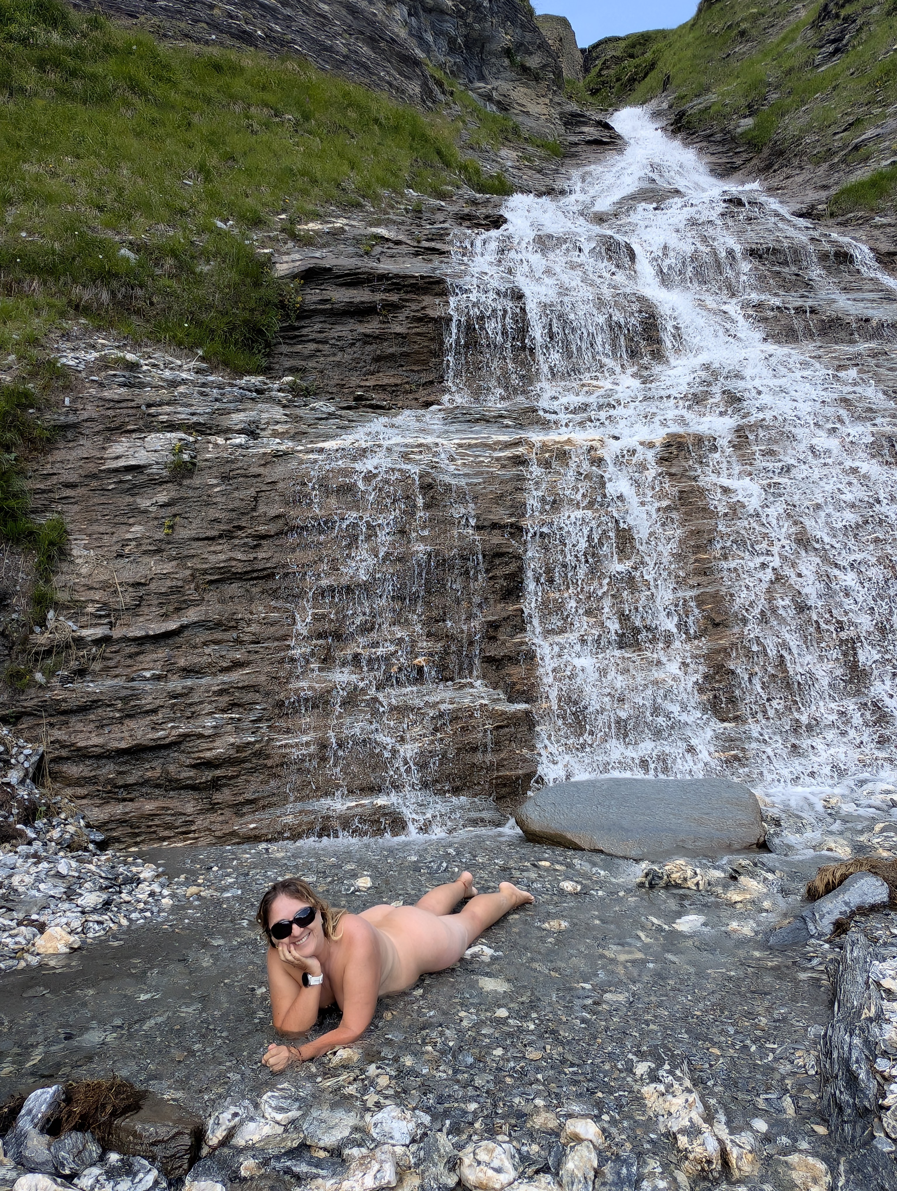Each day, we ventured into the diverse alpine landscape, leaving behind clothes and worries. We walked through meadows full of wildflowers, climbed rocky trails, and marveled at beautiful waterfalls. Even the rain and intense cold didn’t stop us. There’s something invigorating about feeling the cool rain on your bare skin! Most days, we remained naked, feeling nature on every inch of our skin.